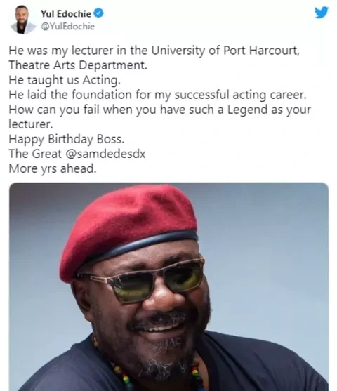 Samuel Dedetoku is popularly known as Sam Dede is a veteran Nollywood actor and movie director. He has achieved success in the Nigerian entertainment industry as he has been featured in over 70 Nollywood movies and has won numerous movie awards. According to the report on Wikipedia, Sam Dede is a lecturer at the University of Port Harcourt. This report was confirmed by famous Nollywood actor, Yul Edochie.He said Sam Dede was his lecture at the University of Port Harcourt, he taught him acting and laid the foundation for my successful acting career.